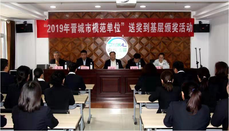 10月11日上午,晉城市總工會(huì)副調(diào)研員刁忠孝、商貿(mào)工會(huì)主席張玉濤、商貿(mào)工會(huì)干事李艷艷一行蒞臨公司舉行“2019年晉城市模范單位”送獎(jiǎng)到基層頒獎(jiǎng)活動(dòng),向公司榮獲“晉城市模范單位”表示祝賀,公司黨支部書(shū)記、總經(jīng)理程晉軍、公司副總經(jīng)理史志霞、公司原黨支部書(shū)記李山虎以及公司部分員工代表參加頒獎(jiǎng)活動(dòng)。公司工會(huì)主席崔偉主持了頒獎(jiǎng)儀式。