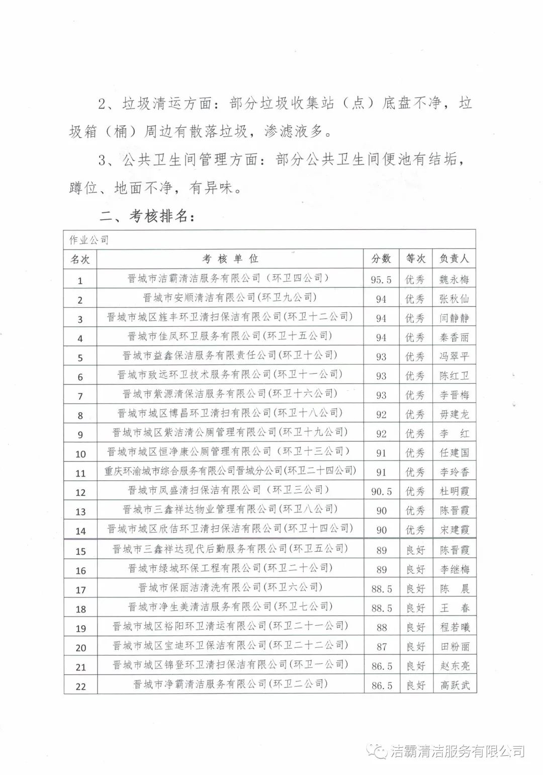2020年10月28日—10月30日,晉城市城區(qū)市容環(huán)衛(wèi)中心由中心督查室牽頭組織,中心班子成員分別帶隊(duì),機(jī)關(guān)全體人員參加,對(duì)各作業(yè)公司道路清掃路段、垃圾收集站(點(diǎn))和公廁采用交叉檢查和隨機(jī)抽查的方式對(duì)24個(gè)作業(yè)公司的環(huán)境衛(wèi)生作業(yè)質(zhì)量和4個(gè)監(jiān)理公司的日常檢查情況進(jìn)行了考核。晉城市潔霸清潔服務(wù)股份有限公司所屬的環(huán)衛(wèi)四公司分?jǐn)?shù)最高,名列第一。