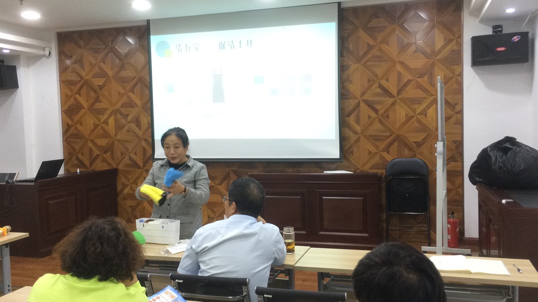 會議開場,從福建福州取經(jīng)回來的人力資源部呂利清用簡短的一句話首先點(diǎn)出了“潔萬家”產(chǎn)品的亮點(diǎn)——“1人1次4小時日常保潔服務(wù)”,接著她從服務(wù)人員、服務(wù)時間、服務(wù)內(nèi)容、保潔工具、保潔流程等方面介紹了“潔萬家”日常保潔與年關(guān)保潔以及居家保潔的區(qū)別,并對服務(wù)內(nèi)容所涵蓋的6大區(qū)域(臥室、衛(wèi)生間、餐廳、客廳、廚房、陽臺)以及專用8色保潔布的分類使用進(jìn)行了詳細(xì)的介紹。