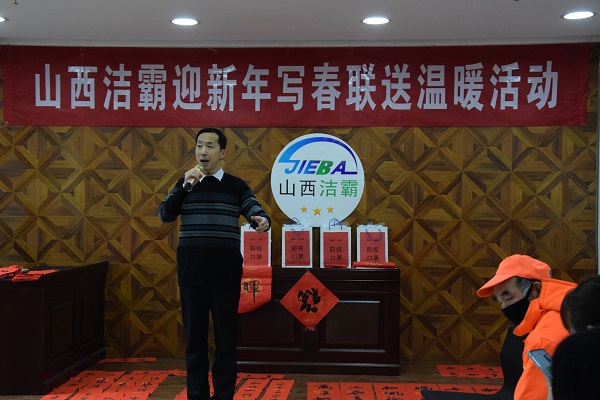 現(xiàn)場人頭攢動(dòng),熱鬧非凡,處處洋溢著歡樂喜慶的氣氛。賈大一老師剛執(zhí)墨筆,就吸引了現(xiàn)場數(shù)十名員工駐足觀賞。他的書法如行云流水,一副寓意著對(duì)新年美好祝福的春聯(lián)便一氣呵成。各位老師揮毫潑墨,一幅幅散發(fā)著清新墨香的春聯(lián)展現(xiàn)在大家面前。“梅花獎(jiǎng)”獲得者張保平老師現(xiàn)場演唱上黨梆子戲曲名段,字正腔圓,渾厚豪邁,把活動(dòng)推向了高潮。市總工會(huì)副主席韓敦峰為員工分發(fā)了對(duì)聯(lián)和防疫口罩。