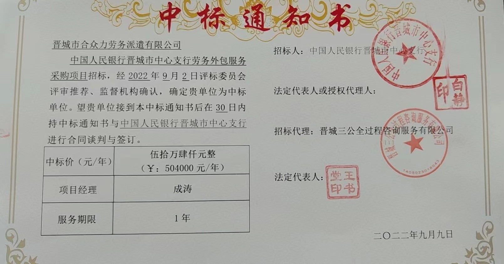 近日,晉城市合眾力勞務(wù)派遣有限公司收到《中標通知書》,確定公司為中國人民銀行晉城市中心支行勞務(wù)外包服務(wù)采購項目的中標人,中標金額504000元。