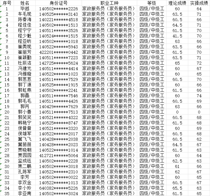 晉城市潔霸清潔服務股份有限公司職業(yè)技能等級認定中心現(xiàn)將2024年1月14日認定人員成績公示如下: