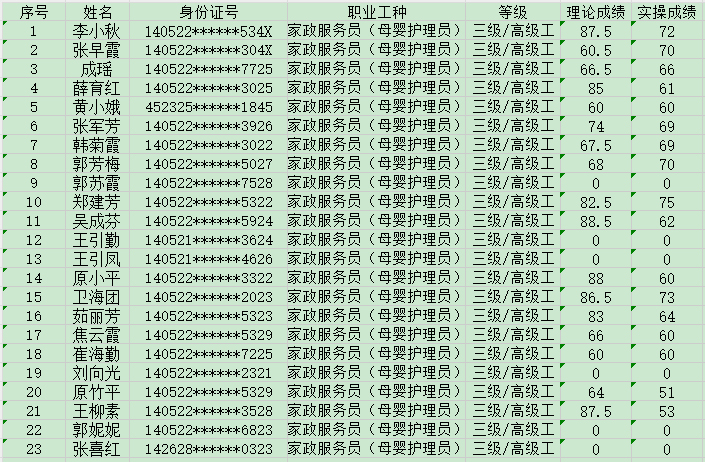 晉城市潔霸清潔服務(wù)股份有限公司職業(yè)技能等級(jí)認(rèn)定中心2024年5月20日上午第13批家政服務(wù)員高級(jí)認(rèn)定人員成績公示