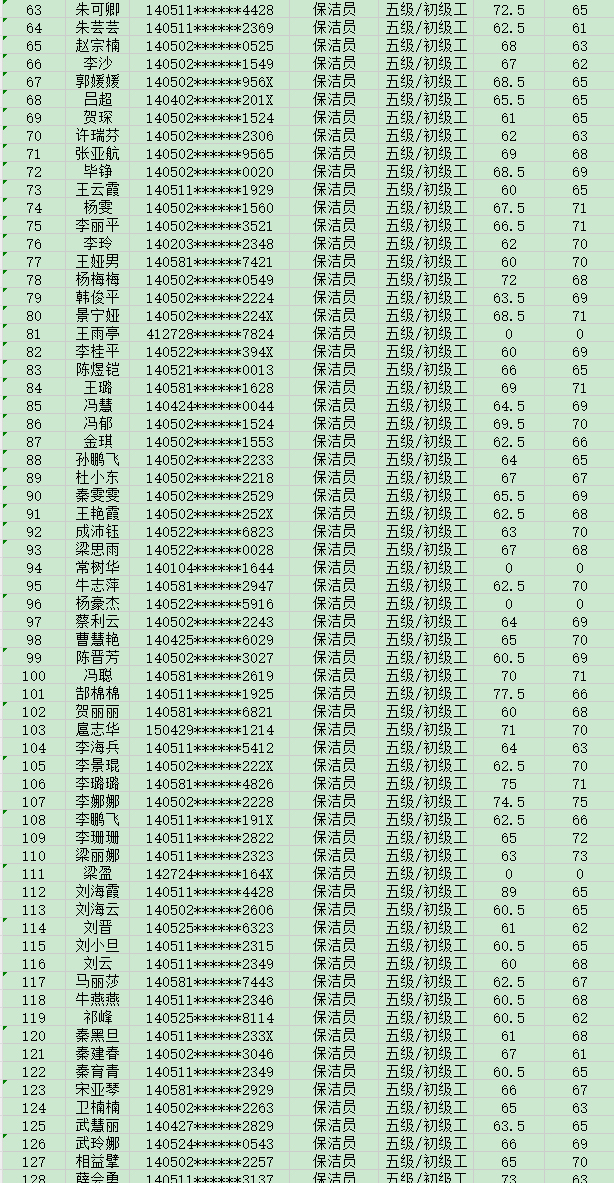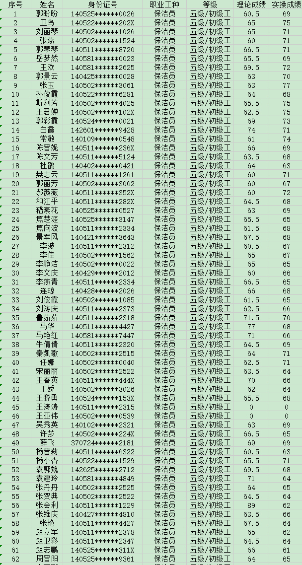 晉城市潔霸清潔服務(wù)股份有限公司職業(yè)技能等級(jí)認(rèn)定中心現(xiàn)將2024年6月2日認(rèn)定人員成績(jī)公示如下: