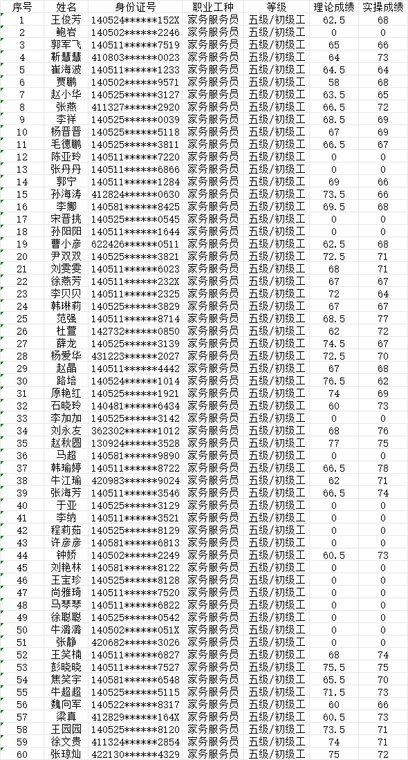 晉城市潔霸清潔服務(wù)股份有限公司職業(yè)技能等級認(rèn)定中心現(xiàn)將2024年7月7日認(rèn)定人員成績公示如下: