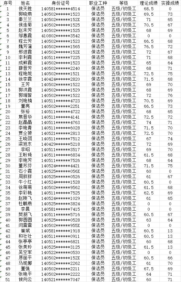 晉城市潔霸清潔服務(wù)股份有限公司職業(yè)技能等級認(rèn)定中心現(xiàn)將2024年7月28日認(rèn)定人員成績公示如下: