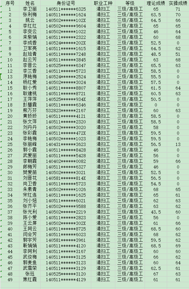 晉城市潔霸清潔服務股份有限公司職業(yè)技能等級認定中心現將2024年8月3日認定人員成績公示如下: