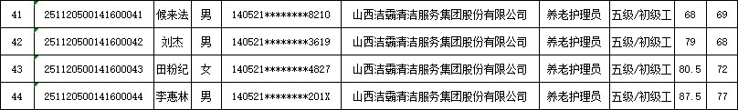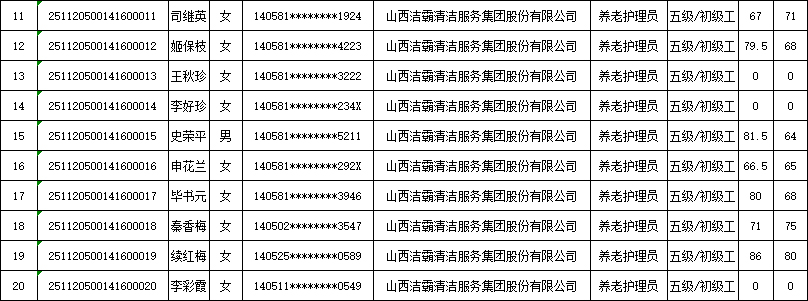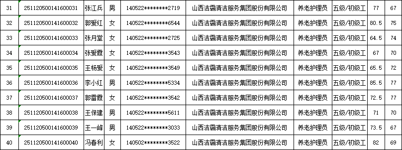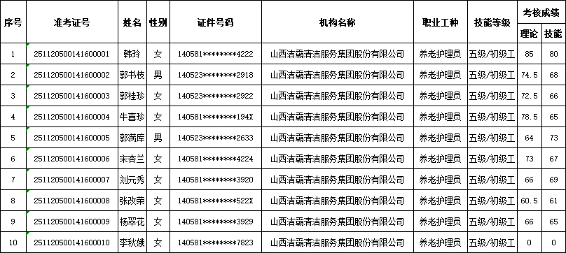 山西潔霸清潔服務(wù)集團(tuán)股份有限公司職業(yè)技能等級(jí)認(rèn)定中心現(xiàn)將2025年11月22日認(rèn)定人員成績(jī)公示如下: