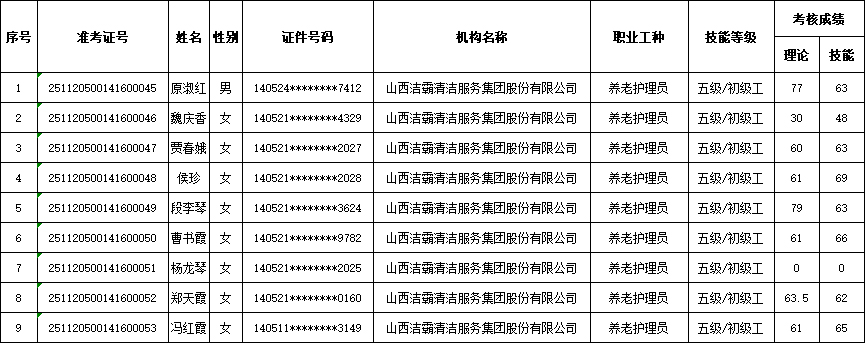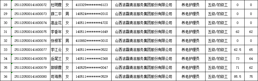 山西潔霸清潔服務集團股份有限公司職業(yè)技能等級認定中心現(xiàn)將2025年11月23日認定人員成績公示如下: